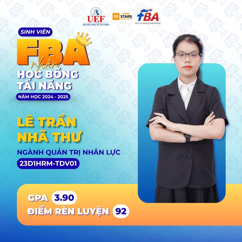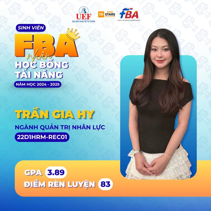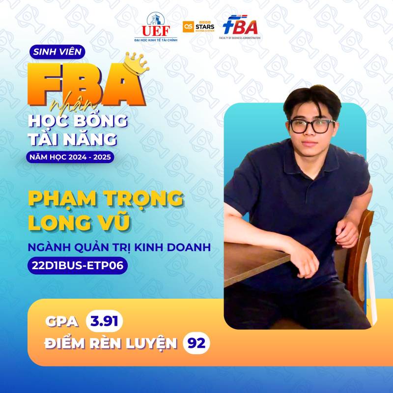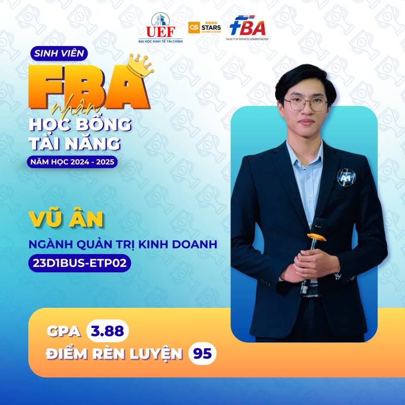 Với Vũ Ân, chữ “Vui” chính là cảm xúc đọng lại khi nhận học bổng. Vui vì đã giữ vững thành tích học tập, vui vì được trải nghiệm nhiều cơ hội mới, và vui vì những đóng góp ý nghĩa cho tập thể FBA. Từ Ban Truyền thông Khoa đến Top 10 Recruitment Conqueror 2025, Ân đã khẳng định năng lực sáng tạo và tinh thần lạc quan. “Vui!” – một chữ ngắn gọn nhưng chứa đựng cả hành trình nỗ lực.