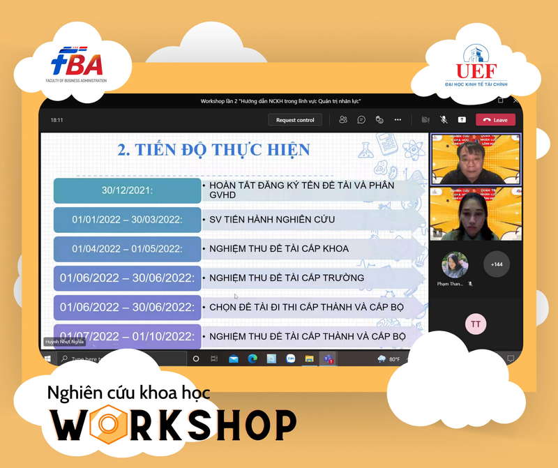 Tại buổi workshop, TS. Huỳnh Nhựt Nghĩa và ThS. Đặng Thị Thanh Thủy đã thông tin tiến độ thực hiện nghiên cứu khoa học sinh viên năm học 2021 - 2022; Đồng thời chia sẻ kinh nghiệm thực hiện một đề tài nghiên cứu khoa học cho sinh viên với các nội dung như: Bố cục một bài nghiên cứu; Các bước nghiên cứu từ lựa chọn đề tài, lập đề cương sơ bộ cho đến triển khai đề tài và báo cáo đề tài; Các tiêu chí cần thiết của một bài nghiên cứu như: Tính khoa học - Tính khả thi - Tính mới và độc đáo - Tính áp dụng,... Những chia sẻ, giải đáp của thầy cô đã giúp cho các bạn sinh viên có cái nhìn rõ hơn về các vấn đề liên quan đến nghiên cứu khoa học.