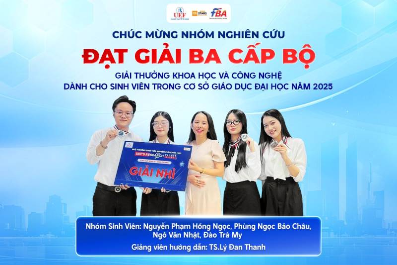 Tháng 11/2025 này, khoa Quản trị Kinh doanh, Trường Đại học Kinh tế – Tài chính TP.HCM (UEF) vừa đón nhận một tin vui đặc biệt từ hoạt động Sinh viên Nghiên cứu Khoa học năm 2025. Nhóm nghiên cứu gồm các sinh viên: Nguyễn Phạm Hồng Ngọc, Phùng Ngọc Bảo Châu, Ngô Văn Nhật và Đào Trà My, dưới sự hướng dẫn của TS. Lý Đan Thanh – Trưởng Khoa Quản trị Kinh doanh UEF, đã xuất sắc đạt Giải Ba Giải thưởng Khoa học và Công nghệ dành cho sinh viên trong các cơ sở giáo dục đại học năm 2025, do Bộ Giáo dục & Đào tạo chủ trì.