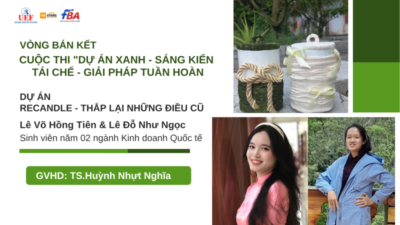 Hai nhóm sinh viên đến từ Trường Đại học Kinh tế - Tài chính TP.HCM (UEF) đã xuất sắc lọt vào Vòng Bán kết cuộc thi “Dự án Xanh – Sáng kiến Tái chế – Giải pháp Tuần hoàn” năm 2025. Cuộc thi do Hội Doanh nghiệp Hàng Việt Nam Chất lượng cao phối hợp cùng Trung tâm BSA và Chương trình HVNCLC – Chuẩn hội nhập tổ chức, nằm trong khuôn khổ Diễn đàn Chuyển đổi Xanh và Ngày hội Tái chế 2025.