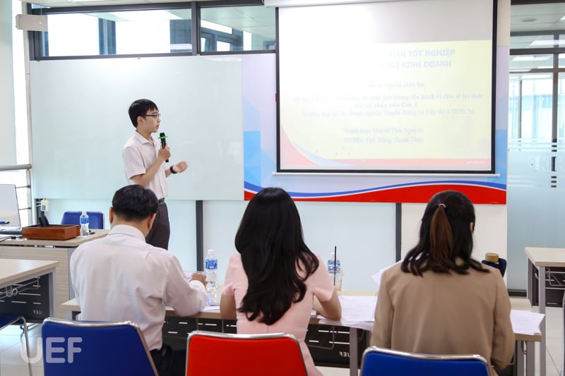 Tham gia bảo vệ khóa luận là những bạn có thành tích học tập tốt và đủ điều kiện, khả năng nghiên cứu. Bằng kiến thức, kinh nghiệm tích lũy trong quá trình học tập, rèn luyện tại UEF cũng như quá trình thực tập thực tế tại các doanh nghiệp, 2 bạn sinh viên (Lê Thị Thanh Bình và Huỳnh Thái Nguyên) đã mạnh dạn thực hiện những đề tài mang tính thực tiễn cao, đáp ứng được sự phát triển trong thời đại 4.0 hiện nay liên quan đến yếu tố ảnh hưởng đến quyết định nhảy việc của Gen Z tại khu vực TP.HCM và các yếu tố văn hóa tổ chức ảnh hưởng đến hành vi chia sẻ tri thức đối với nhân viên Gen Z.