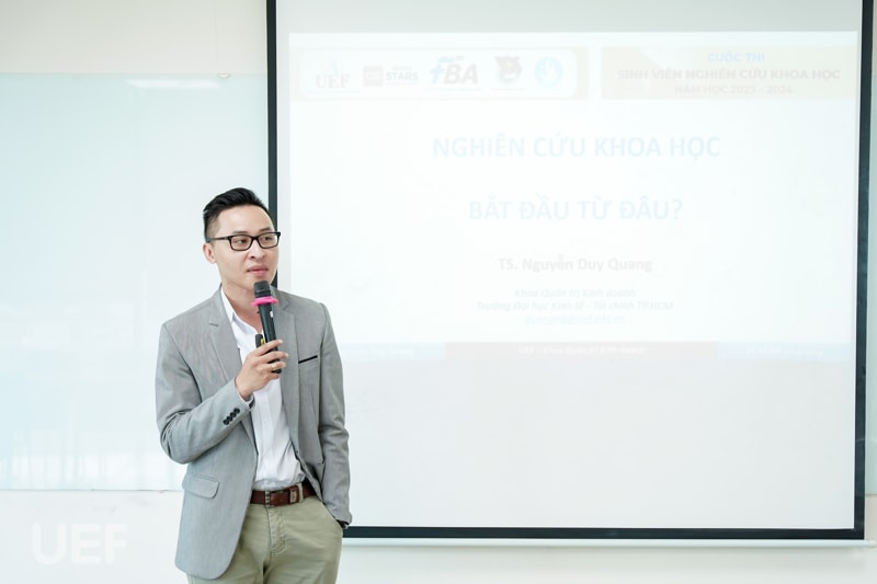 Trả lời câu hỏi ở đầu workshop “Nghiên cứu khoa học bắt đầu từ đâu?”, diễn giả đã liệt kê 3 bước: xác định vấn đề, nghiên cứu tài liệu và cuối cùng là tiến hành viết nghiên cứu. Không chỉ dừng lại ở đó, thầy còn giới thiệu đến các sinh viên Nhà UEF về kết cấu 3 chương và 5 chương trong nghiên cứu khoa học. Đồng thời hướng dẫn các bạn cách tìm kiếm tư liệu, lý thuyết chính xác nhất giữa một "rừng" thông tin trên mạng xã hội.