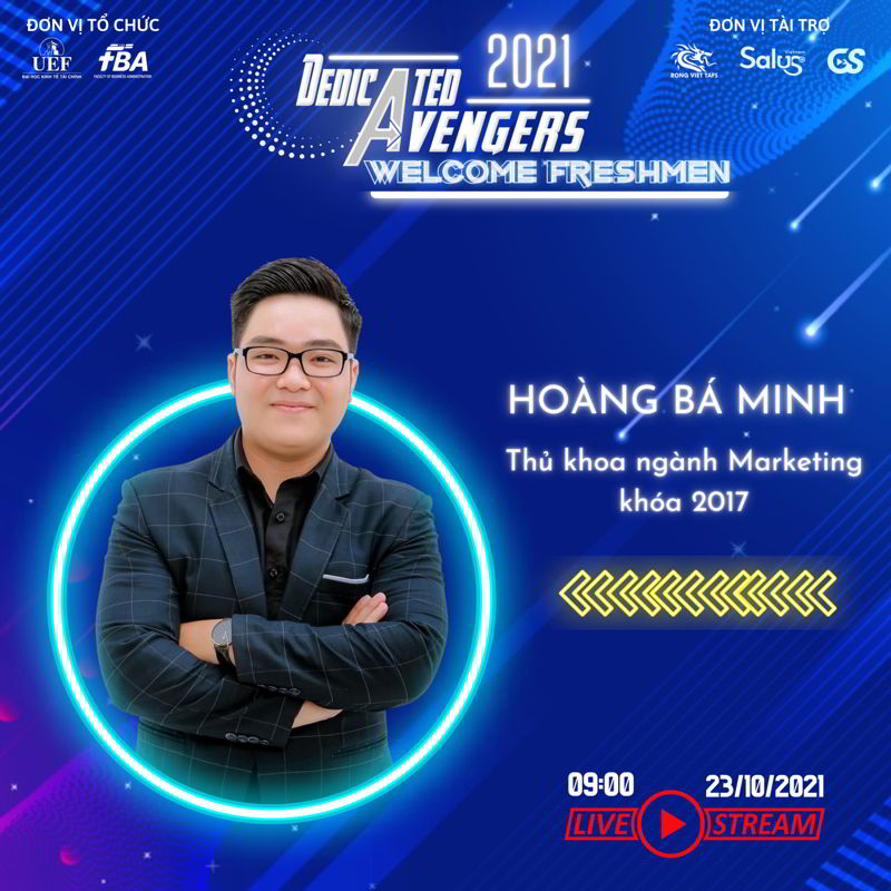 Là cựu sinh viên nổi bật tại UEF, Bá Minh đã có một quãng thời gian học tập, gắn bó tại trường với nhiều kinh nghiệm trong việc học lẫn rèn luyện và phát triển bản thân. Từng là thành viên của bộ ba Á quân Student Debate khi chỉ mới là sinh viên năm nhất, Bá Minh đã ghi dấu ấn đẹp tại Nhà UEF và tạo bước khởi đầu tốt đẹp cho 4 năm học tập tại trường. Tại chương trình, cựu sinh viên Hoàng Bá Minh sẽ đem đến nhiều màu sắc mới mẻ, những trải nghiệm độc đáo tạo UEF, và định hướng các bạn tân sinh viên để có thể khởi động tốt tại giảng đường đại học.
