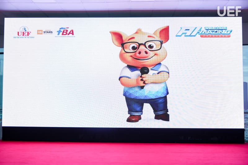 Với tinh thần thích ứng và sáng tạo, bên cạnh người dẫn chương trình, Khoa Quản trị kinh doanh đã gây ấn tượng với các “newbies” qua hình ảnh MC Heo Vàng, được thực hiện bằng công nghệ AI.