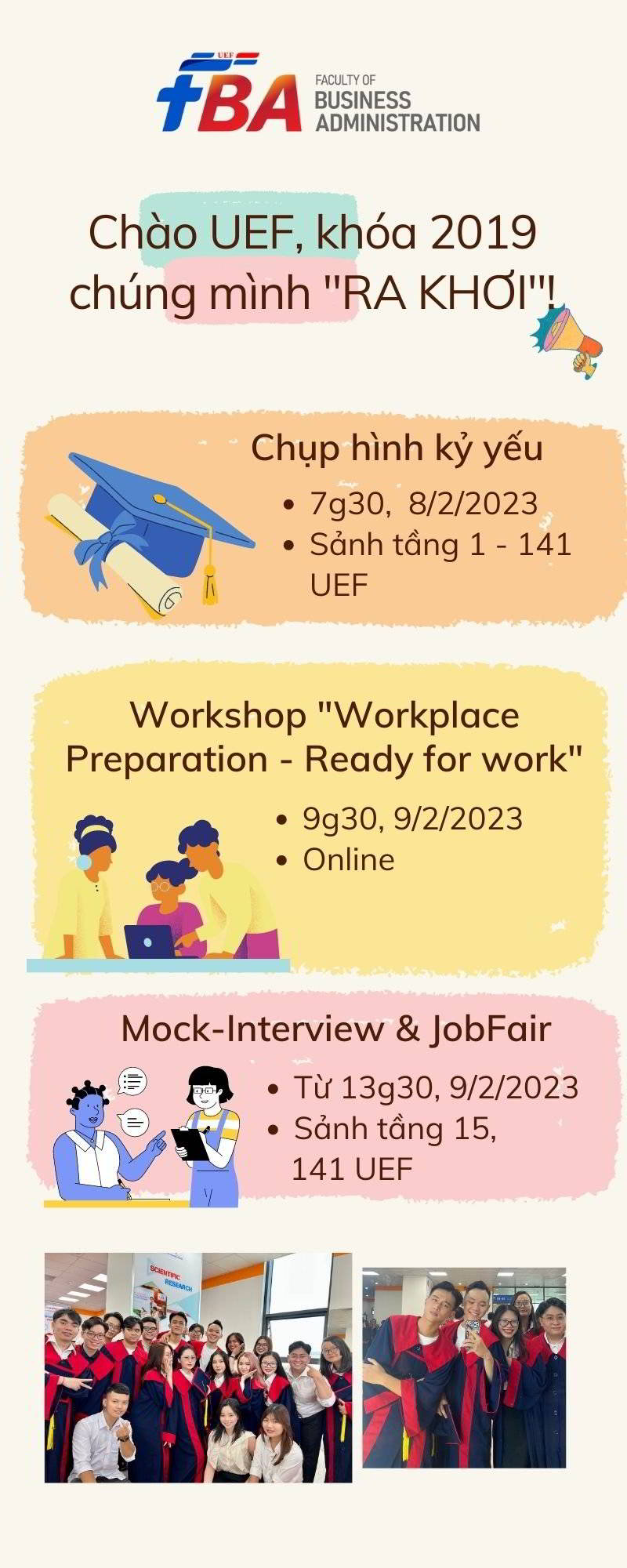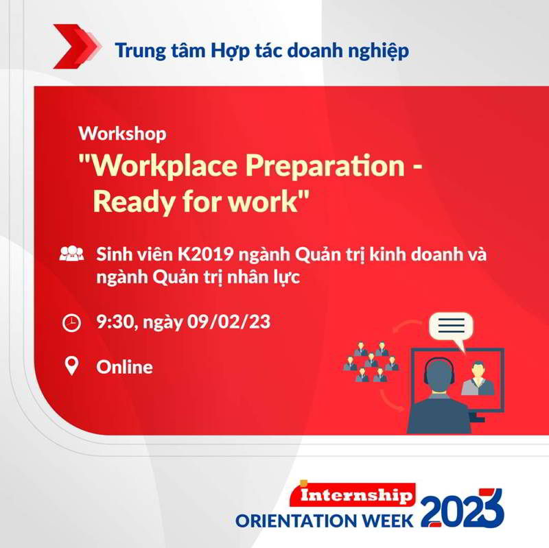 Tại workshop "Workplace Preparation - Ready for work" dành riêng cho sinh viên khóa 2019 của khoa Quản trị kinh doanh được diễn ra lúc 9g30, ngày 9/2/2023, các bạn sẽ có được bức tranh tổng quát về học phần thực tập, gồm: