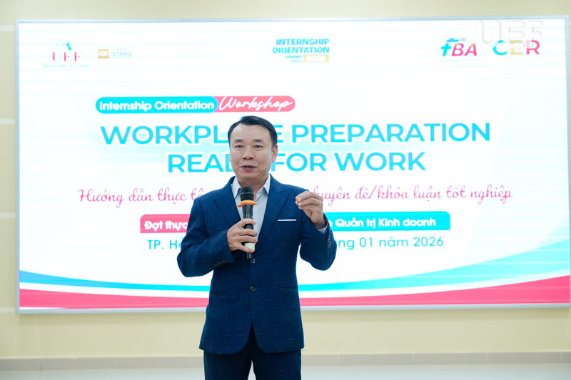 Hiểu rõ yêu cầu này, trong tháng 1/2026, Khoa Quản trị kinh doanh đã phối hợp với Trung tâm Hợp tác doanh nghiệp tổ chức workshop "Workplace Preparation - Ready for Work" nhằm hướng dẫn thực tập tốt nghiệp và chuyên đề tốt nghiệp dành cho sinh viên ngành Quản trị nhân lực đợt T04.2026.