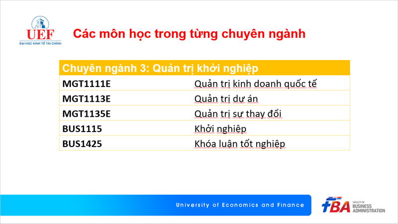 Với chuyên ngành Quản trị khởi nghiệp, chương trình đào tạo tập trung vào nhóm kiến thức và kỹ năng khởi tạo, quản lý các hoạt động kinh doanh của một doanh nghiệp mới. UEFers sẽ được học các môn như: Quản trị kinh doanh quốc tế, Quản trị dự án, Quản trị sự thay đổi, Khởi nghiệp,...