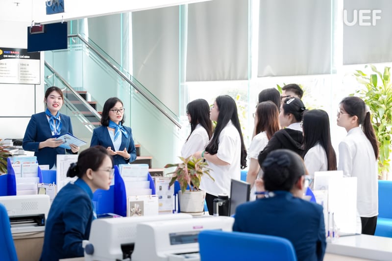 Bên cạnh đó, đoàn sinh viên UEF cũng có dịp tham quan chi nhánh Vietbank TP.HCM, trực tiếp quan sát không gian làm việc và quy trình giao dịch tại quầy. Hoạt động giúp sinh viên hình dung rõ hơn về công việc thực tế của nhân viên ngân hàng, từ khâu tiếp đón, tư vấn đến phục vụ khách hàng.