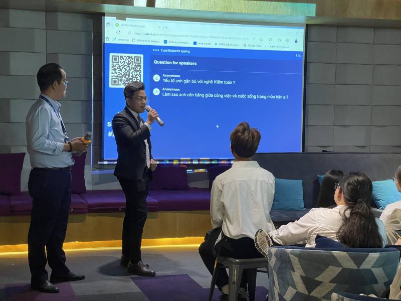 Để bắt đầu buổi trao đổi, anh Phạm Ngọc Hùng - trưởng nhóm tuyển dụng của KPMG đã chia sẻ các cơ hội nghề nghiệp tại công ty từ giai đoạn thực tập cho đến các cơ hội tuyển dụng sau khi ra trường cũng như thăng tiến trong quá trình làm việc tại đơn vị. Nhằm để truyền lửa cho các bạn sinh viên thêm động lực với nghề, anh Phạm Quốc Huy với vai trò là cựu sinh viên UEF và hiện là Giám Đốc khối Kiểm toán đã có những chia sẻ hết sức chân thật và sâu sắc về nghề, cơ duyên đến với KPMG cũng như những trải nghiệm thực tế trong nghề kiểm toán cho các bạn sinh viên. Thông qua hỏi đáp, hai diễn giả “bật mí” những yếu tố mà nhà tuyển dụng mong muốn từ phía các bạn sinh viên để từ đó có cơ sở để giúp các bạn định hướng rõ nét hơn về nghề nghiệp mà mình sẽ theo đuổi cũng như những kỹ năng cần phải tích luỹ trước khi ra trường.