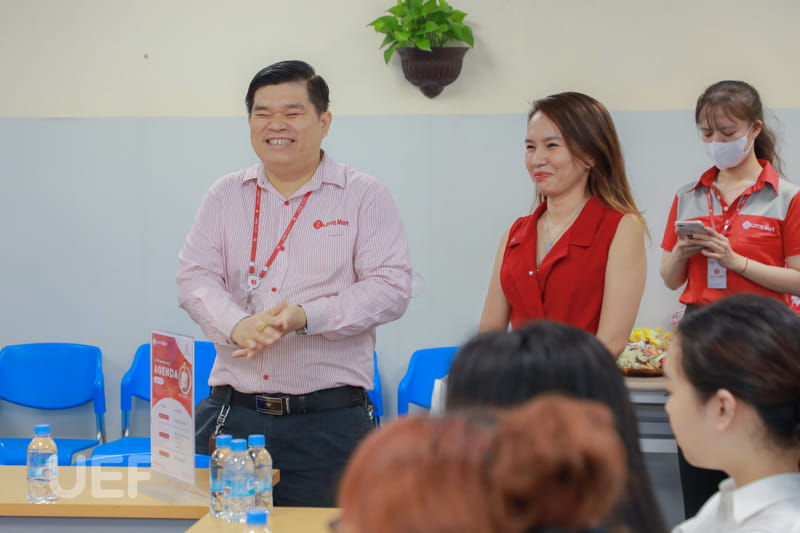 Phát biểu mở đầu buổi tham quan, ông Nguyễn Chí Cường bày tỏ sự vui mừng và vinh dự khi được đón tiếp đoàn sinh viên UEF đến học hỏi tại Lotte Mart Gò Vấp. Với bề dày kinh nghiệm trong việc tổ chức và quản lý doanh nghiệp, ông Cường đã có những chia sẻ sơ bộ về kinh nghiệm của mình trong quá trình khởi nghiệp, đồng thời khẳng định một thái độ tốt sẽ là chiếc “chìa khóa vàng” giúp sinh viên chinh phục nhà tuyển dụng.