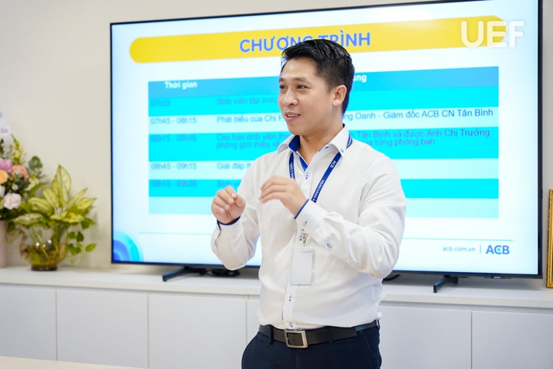Về phía ngân hàng ACB, đoàn được chào đón và hướng dẫn bởi bà Phạm Trương Hoàng Oanh - Giám đốc ACB chi nhánh Tân Bình cùng các anh chị Trưởng phòng từ các phòng ban trong ngân hàng. Sự hỗ trợ nhiệt tình từ phía ACB đã mang đến cho sinh viên những trải nghiệm thực tế giá trị và cái nhìn sâu sắc về môi trường làm việc tại ngân hàng.
