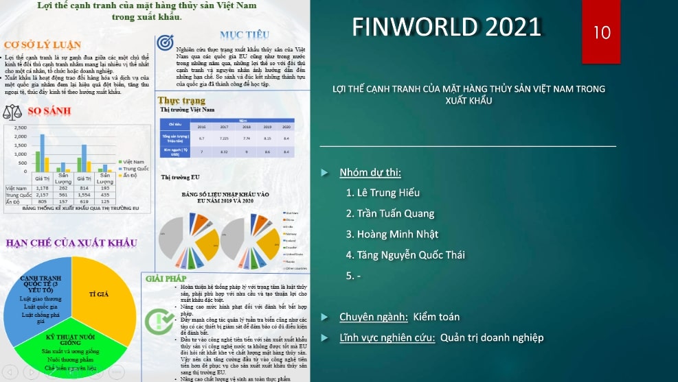 3 đề tài nhóm Quản trị doanh nghiệp: “Phân tích phát triển bền vững trong xu hướng hội nhập của doanh nghiệp Việt Nam”, “Lợi thế cạnh tranh của mặt hàng thủy sản Việt Nam trong xuất khẩu”, “ Chiến lược kinh doanh và xu hướng phát triển của FMCG tại Việt Nam”; 1 đề tài nhóm Tài chính quốc tế: “Nghiên cứu về thực trạng đầu tư trực tiếp nước ngoài tại Việt Nam”; 2 đề tài nhóm Thị trường tài chính: “Tìm hiểu về thị trường Trái phiếu doanh nghiệp tại Việt Nam”, “Thúc đẩy phát triển tín dụng xanh tại các Ngân hàng thương mại Việt Nam”;