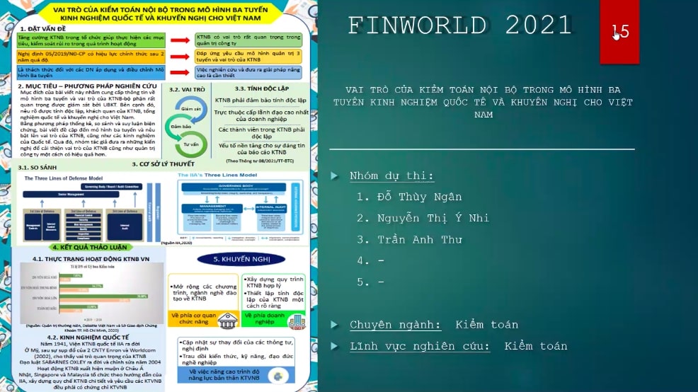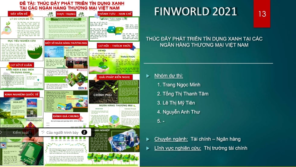 Trong đó, các đề tài như “Thúc đẩy phát triển tín dụng xanh tại các Ngân hàng thương mại Việt Nam”, “Phát huy năng lực của sinh viên khi chuyển sang IFRS - Kinh nghiệm quốc tế và khuyến nghị cho Việt Nam”, “Nghiên cứu về việc phát hành tiền kỹ thuật của ngân hàng trung ương”, “Hệ sinh thái thúc đẩy thanh toán không dùng tiền mặt - Trường hợp của Grab và khuyến nghị cho các doanh nghiệp thương mại điện tử”,... được Ban giám khảo đánh giá khá tốt về nội dung và ý tưởng. Cách trình bày của sinh viên lưu loát, tự tin và hiểu rõ vấn đề mình đang phân tích.