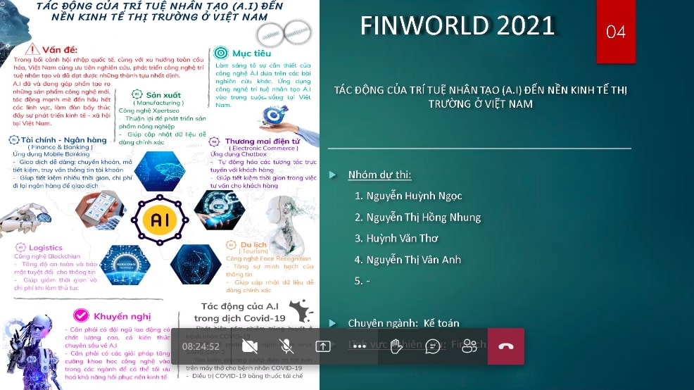 4 đề tài nhóm Fintech: “Phân tích tác động của trí thông minh nhân tạo (AI) đến nền kinh tế thị trường ở Việt Nam”, “ Các yếu tố tác động lên sự chuyển đổi số của các ngân hàng thương mại Việt Nam”, “Nghiên cứu về việc phát hành tiền kỹ thuật của ngân hàng trung ương”, “Hệ sinh thái thúc đẩy thanh toán không dùng tiền mặt - Trường hợp của Grab và khuyến nghị cho các doanh nghiệp thương mại điện tử”; 1 đề tài nhóm Thị trường chứng khoán: “Phân tích biến động về hiệu quả hoạt động kinh doanh của các Công ty hàng không niêm yết trên thị trường chứng khoán Việt Nam thời kỳ trước và sau dịch Covid-19”.