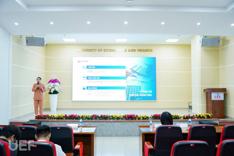 Trong buổi workshop, bà Tuyết Loan cũng mang đến cho UEFers một vài thông tin liên quan đến chứng chỉ CMA - chứng chỉ quốc tế về kế toán quản trị được cấp bởi Hiệp hội Kế toán Quản trị Hoa Kỳ (IMA). Đây là một bằng cấp khá quan trọng và cần thiết để các bạn sinh viên có thêm kiến thức, tạo dựng giá trị cho bản thân trong lĩnh vực tài chính - kế toán. Hiện tại, Smart Train đang tổ chức đào tạo khóa học CMA. Đối với sinh viên UEF, các bạn sẽ nhận được nhiều ưu đãi về học phí tại học viện. Vì vậy, nếu UEFers có nhu cầu nâng cao kiến thức, bổ sung chứng chỉ quốc tế có thể tìm hiểu và đăng ký khóa học CMA tại học viện Smart Train.