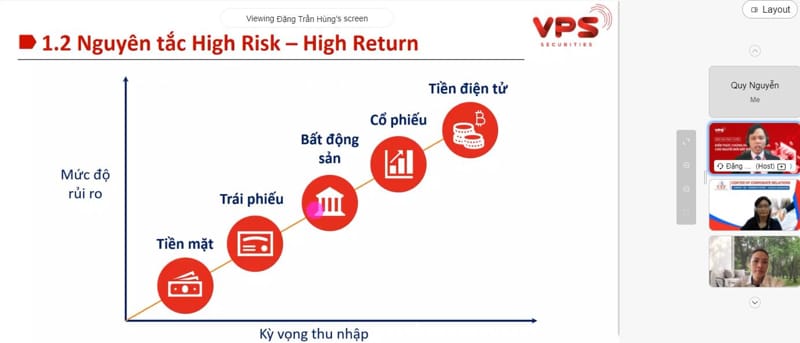Tiếp đó, anh Hùng đã chia sẻ cụ thể hơn về chứng khoán bằng những ví dụ minh họa. Anh nhấn mạnh rằng: “Chứng khóa là sự kết nối giữa doanh nghiệp cần vốn và nhà đầu tư cần lợi nhuận”. Chứng khoán chủ yếu được chia thành 3 loại, có chứng khoán vốn (cổ phiếu, chứng chỉ quỹ), chứng khoán nợ (trái phiếu) và công cụ tài chính (chứng quyền,..). Một số khía cạnh chi tiết như các chủ thể tham gia thị trường chứng khoán, cổ phiếu, cổ đông, quyền lợi của cổ đông trong doanh nghiệp, cách sở hữu cổ phiếu, cách thu lợi,… cũng được khách mời đề cập đến.
