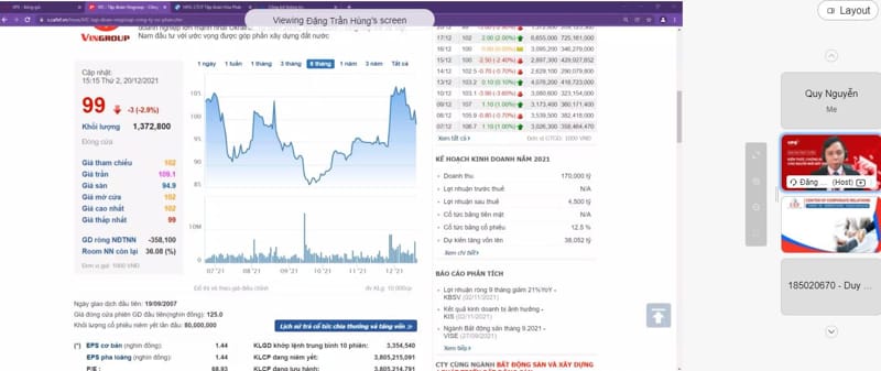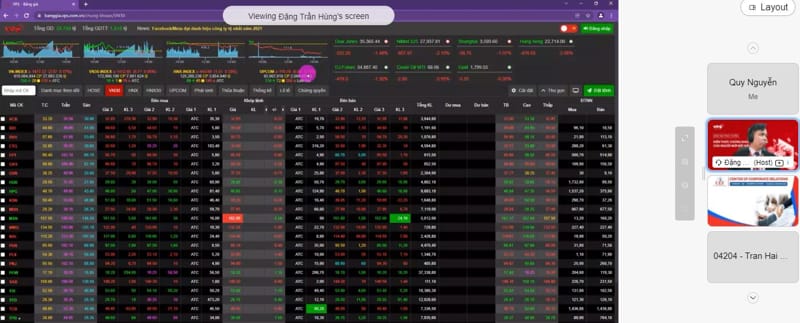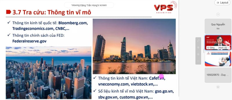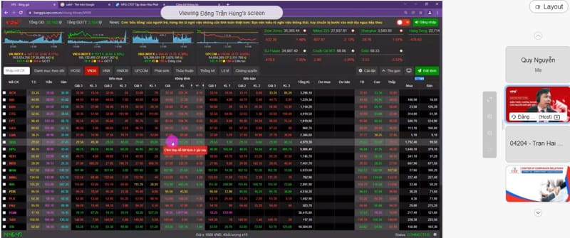 Diễn giả trình chiếu một phiên giao dịch đang diễn ra, phân tích các thông số để sinh viên hiểu rõ hơn về vấn đề