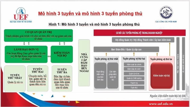 ThS. Lê Phương Dung là báo cáo viên trình bày tham luận 3. Phần chia sẻ của cô đã phân tích chi tiết về mô hình 3 tuyến và mô hình 3 tuyến phòng thủ khi nhắc đến vai trò của kiểm toán nội bộ. Từ đó đi đến kết luận về những tính cách, kỹ năng cần có đối với bản thân kiểm toán nội bộ và đề ra giải pháp phù hợp.