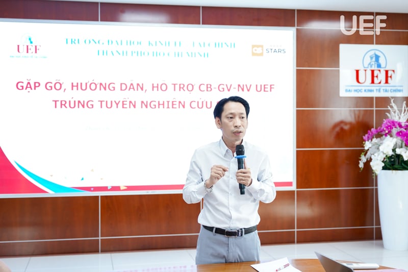 Tại đây, đại diện Phòng Khoa học công nghệ và Dự án quốc tế - PGS.TS. Nguyễn Thành Luân đã giới thiệu chi tiết Thông báo số 83/TB-UEF, đồng thời phổ biến nội dung hai Quyết định liên quan là 711/QĐ-UEF và 714/QĐ-UEF. Đây là những văn bản chính thức về việc triển khai chế độ khuyến khích, hỗ trợ CB-GV học tập, bồi dưỡng đạt trình độ Tiến sĩ từ năm học 2024-2025.