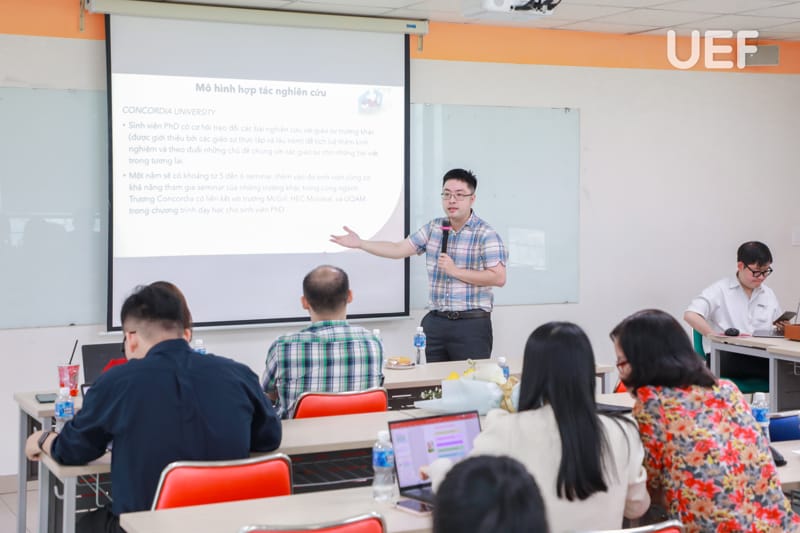 Về chủ đề công bố quốc tế đối với đề tài nghiên cứu khoa học, TS. Bùi Thanh Long đã chia sẻ và dẫn chứng liên quan đến hệ thống dữ liệu, mô hình nghiên cứu hợp tác ở các trường đại học quốc tế như University of Arkansas, Concordia University. Đồng thời, thầy cũng đề cập đến lĩnh vực nghiên cứu và học vấn của người học tại Concordia University để các giảng viên tham khảo.
