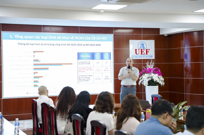 Theo báo cáo của TS. Nguyễn Thành Luân, thành tích về loại hình và số lượng công trình nghiên cứu khoa học trong năm học 2023 - 2024 có sự vượt trội mạnh mẽ so với năm học trước. Trong đó, số lượng bài báo đăng kỷ yếu trong nước dẫn đầu về mặt số lượng. Thầy cũng điểm qua số lượng các đề tài nghiên cứu cấp trường đã được nghiệm thu. Đồng thời, đặt lên bàn cân số lượng nghiên cứu công bố quốc tế, trong nước, cấp thành phố, cấp trường giữa các đơn vị với nhau.