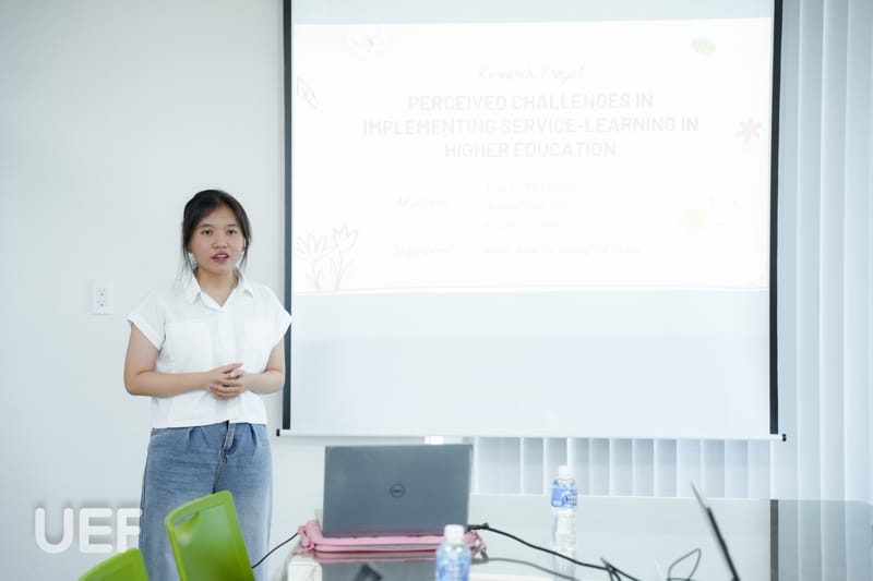 Có 4 đề tài được trình bày gồm: (1) University students’ perceptions of critical thinking in academic writing: A study at Ho Chi Minh City University of Economics and Finance - Trương Quốc Bình; (2) Perceived challenges in implementing service-learning in higher education - Trần Lê Thu Hương, Võ Quốc Cường, Nguyễn Trúc Anh; (3) Teachers and students’ perspectives on Grammarly as an AI-powered tool for enhancing writing skills - Trần Võ Như Quỳnh, Trần Thị Hồng Nhung, Nguyễn Minh Hiếu; (4) English major students' perceptions towards the effects and limitations of automated writing evaluation tool Grammarly (free version) at Ho Chi Minh City University of Economics and Finance - Trần Ngọc Quý.
