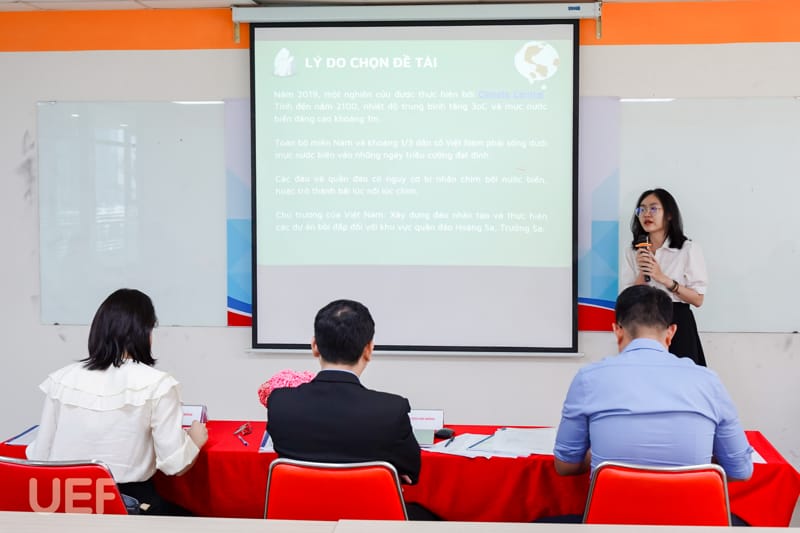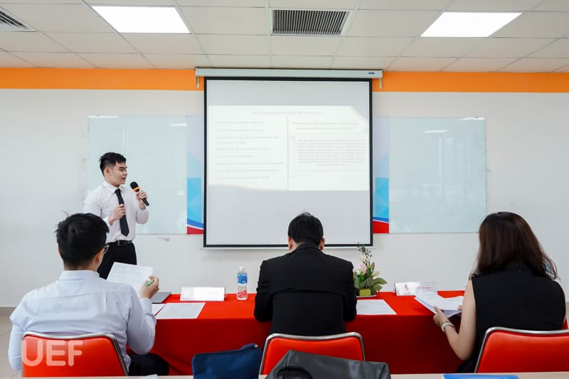 Các bạn sinh viên lần lượt trình bày tóm tắt nội dung, kết quả nghiên cứu của mình trong thời gian 10 phút và trả lời các câu hỏi của thầy, cô trong Hội đồng.