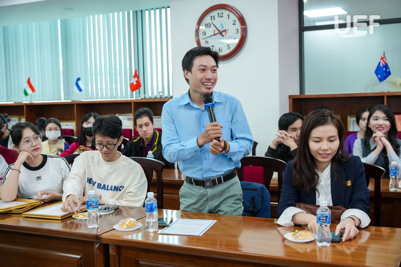 Xoay quanh hoạt động nghiên cứu, các diễn giả khách mời cùng chia sẻ câu chuyện khơi nguồn cảm hứng nghiên cứu và giữ được "ngọn lửa" đam mê trong mình. PGS.TS. Dương Mỹ Thẩm và ThS. Ngô Nguyễn Thiên Duyên nhấn mạnh vào giá trị khi tham gia hoạt động nghiên cứu như tìm ra những điều mới mẻ, trang bị kiến thức chuyên môn, kỹ năng, phát triển tư duy phản biện cùng cơ hội nghề nghiệp hấp dẫn,... Bạn Thu Hương cũng dành ra một số lời khuyên hữu ích gửi đến UEFers trên hành trình chuẩn bị, bắt tay vào xây dựng cho mình công trình nghiên cứu riêng.