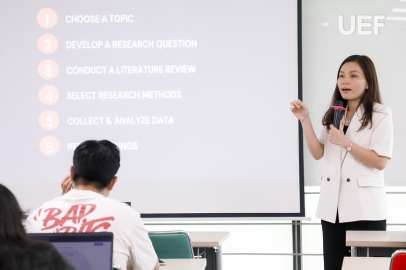 Với mục đích kết nối cộng đồng sinh viên đam mê nghiên cứu khoa học, thúc đẩy hoạt động nghiên cứu, sáng tạo và phát triển toàn diện của UEFers, Khoa Tiếng Anh đã khởi động chuỗi workshop về nghiên cứu khoa học, chia sẻ nhiều kỹ năng cần thiết cho các bạn. Buổi đầu tiên với chủ đề “Preliminary Guide to Doing Research” đã được tổ chức vào sáng ngày 23/10.