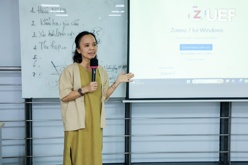 Nối tiếp chương trình, cô Kim Trí giới thiệu chi tiết về các công cụ và phương pháp hỗ trợ tối ưu hóa quá trình nghiên cứu tài liệu. Cô đã giúp sinh viên hiểu rõ hơn về cách quản lý và xử lý nguồn tài liệu một cách hiệu quả.