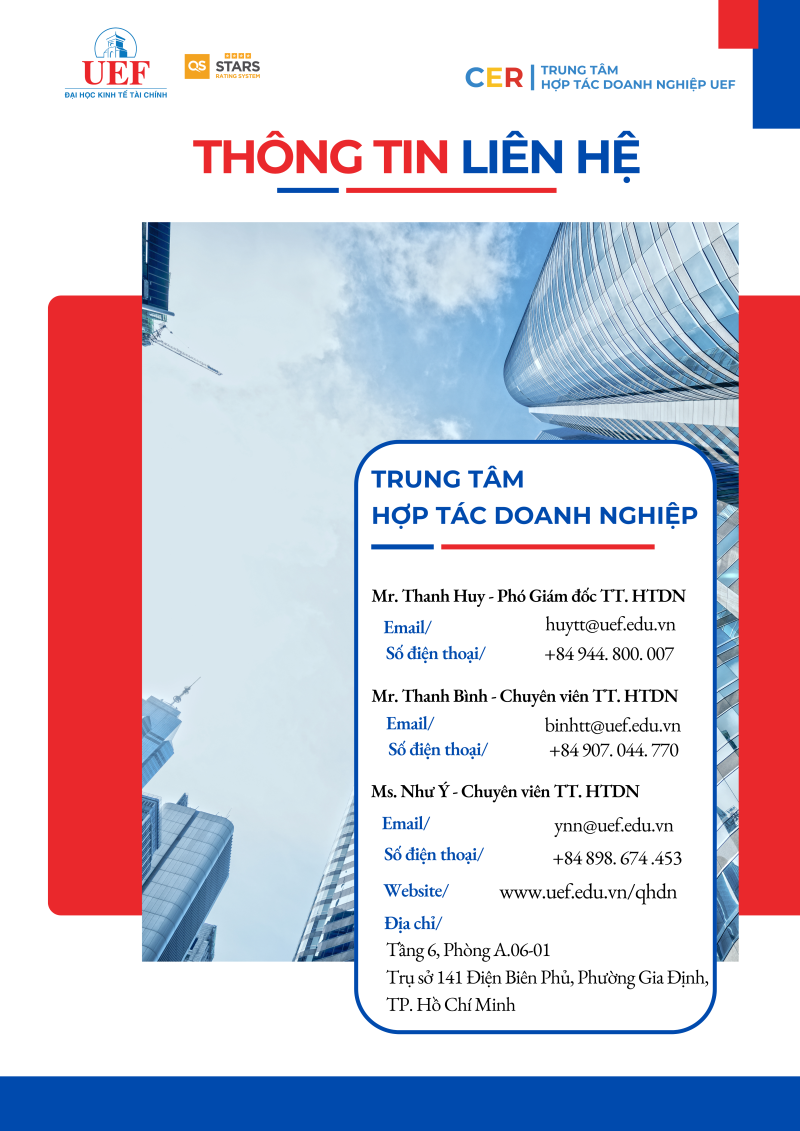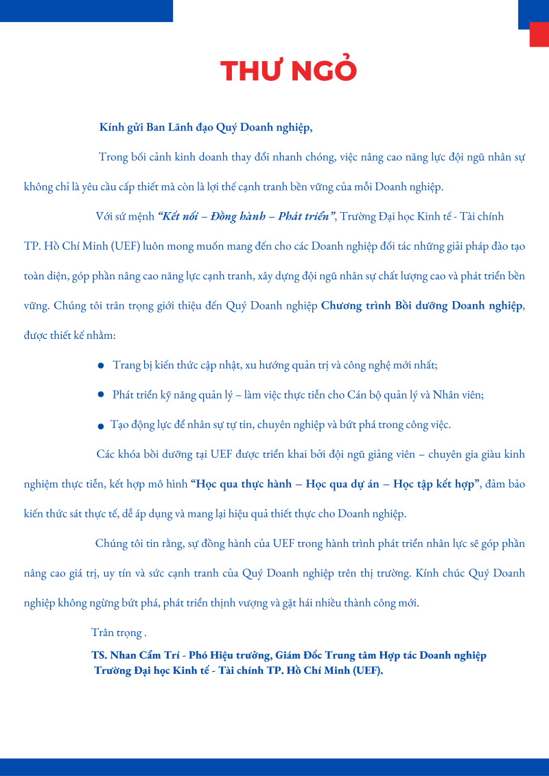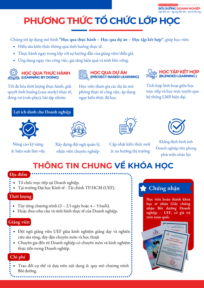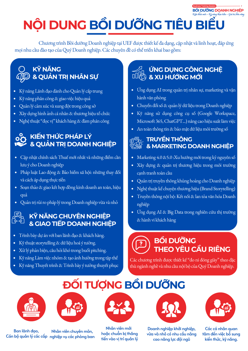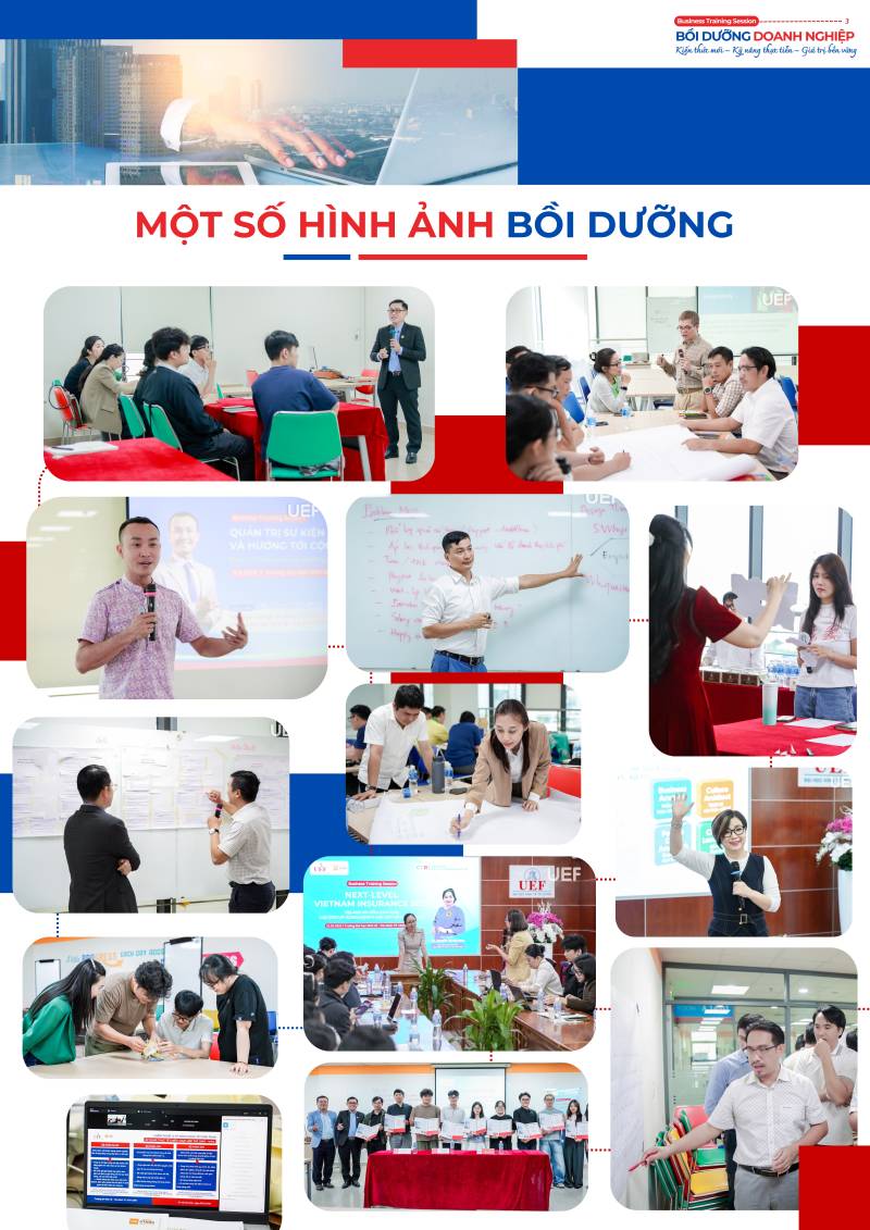 Trung tâm Hợp tác Doanh nghiệp – UEF tổ chức Chương trình Bồi dưỡng Doanh nghiệp với mục tiêu đồng hành cùng các đơn vị trong việc phát triển nguồn nhân lực chất lượng cao. Chương trình tập trung trang bị cập nhật kiến thức, kỹ năng và xu hướng mới trong bối cảnh hội nhập, góp phần xây dựng đội ngũ cán bộ, nhân sự chuyên nghiệp, sáng tạo và thích ứng nhanh với thay đổi.