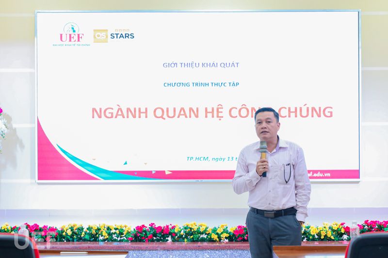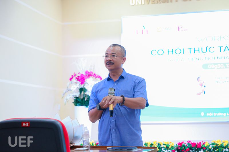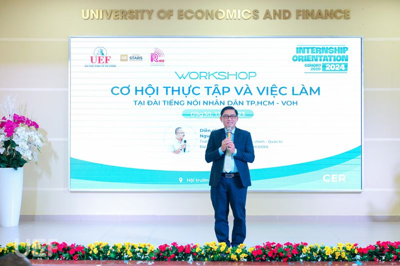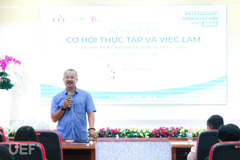 Phát biểu mở đầu buổi workshop, TS. Nhan Cẩm Trí nhấn mạnh: “Hôm nay là cơ hội rất tốt cho sinh viên Quan hệ công chúng và Truyền thông và cả những bạn có niềm đam mê với lĩnh vực báo chí, truyền thanh, truyền hình tìm hiểu và bước vào những vị trí việc làm tại Đài Tiếng nói Nhân dân TP.HCM. VOH là một trong những đối tác chiến lược của UEF. Nhân dịp này, tôi cũng gửi lời cảm ơn đến quý đơn vị đã luôn sát cánh tài trợ cho nhiều cuộc thi, sân chơi, đồng hành với các workshop, talkshow,... mà UEF tổ chức”.