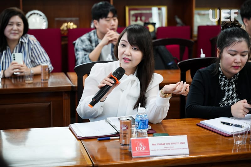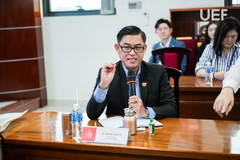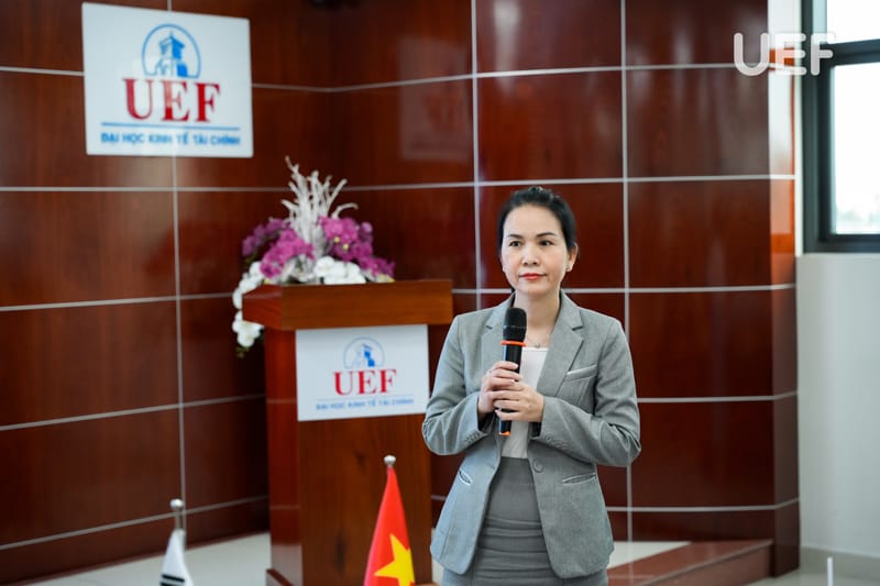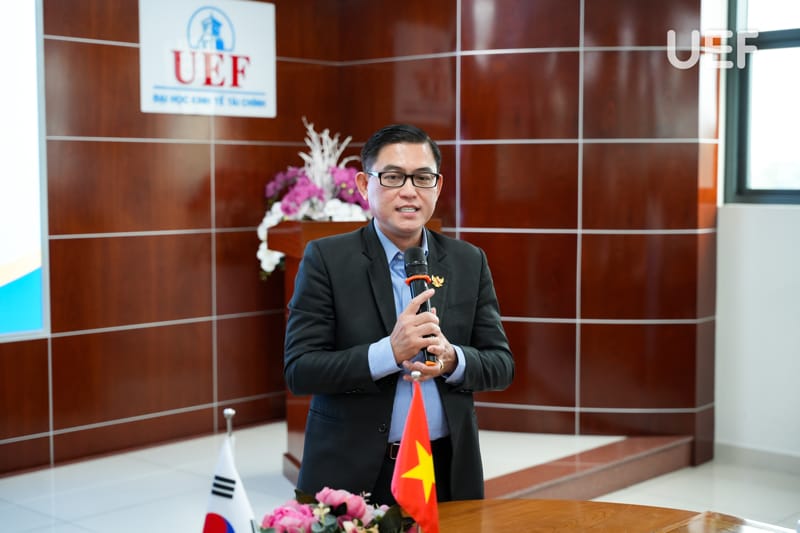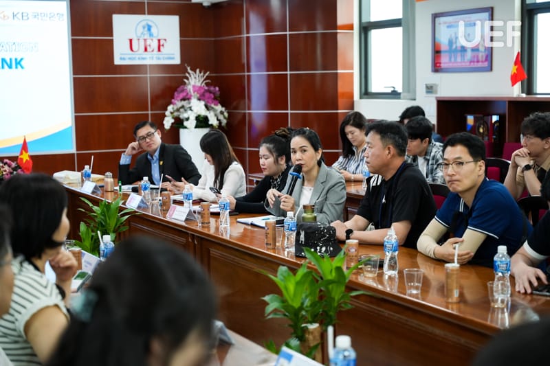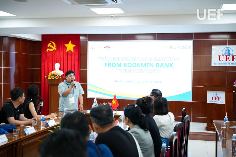 Bên cạnh đó, TS. Nhan Cẩm Trí giới thiệu tổng quan về định hướng quốc tế hóa giáo dục của UEF, trong đó nhấn mạnh mô hình học tập gắn kết hoạt động cộng đồng (Service learning) và các chương trình phối hợp doanh nghiệp nhằm giúp sinh viên tiếp cận sớm môi trường làm việc chuyên nghiệp. Đại diện UEF cũng đề xuất nhiều hướng hợp tác với Ngân hàng Kookmin trong tương lai, thúc đẩy chương trình thực tập, làm việc cho sinh viên UEF.