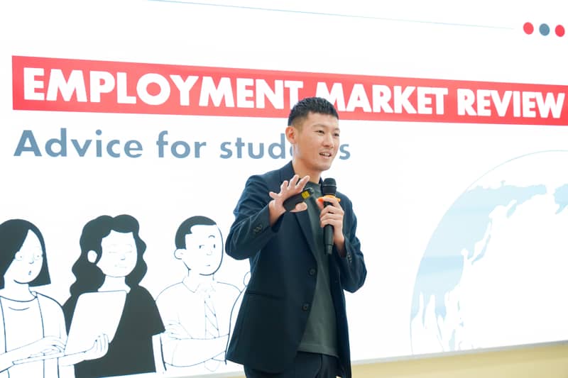 Mở đầu buổi workshop, ông Hiroki Nakani đã giúp các bạn sinh viên hình dung những sự biến đổi của thị trường lao động trong một vài năm gần đây, đồng thời dự đoán tiềm năng phát triển của các ngành nghề. Theo diễn giả, vì nhiều lý do khác nhau mà trong năm 2023, cả thế giới đã phải trải qua “làn sóng layoff” nghiêm trọng với hơn 473 ngàn người bị mất việc. Trong đó, tại Việt Nam, hơn 68% doanh nghiệp đã tiến hành cắt giảm nhân sự và hơn 52% đơn vị hạn chế các hoạt động tuyển dụng. Đến năm 2024, thị trường lao động phát triển mạnh hơn với những bước tiến mới, song, việc tìm kiếm nguồn nhân lực đáp ứng được yêu cầu của công ty vẫn là một bài toán lớn. Để có thể thành công chinh phục những vị trí công việc mà mình mong muốn đòi hỏi các ứng viên phải vững kiến thức chuyên môn, “làm giàu” vốn kỹ năng mềm cần thiết cũng như có hiểu biết sâu rộng trên đa lĩnh vực.