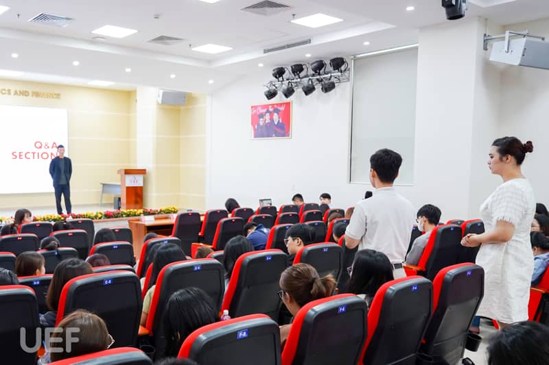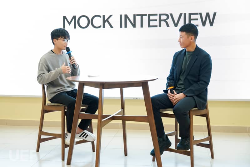 Nằm trong khuôn khổ sự kiện, các bạn sinh viên Nhà UEF còn được trải nghiệm buổi Mock-Interview cùng ông Hiroki Nakani. Tương tự như một buổi phỏng vấn thực tế, sinh viên tham gia lần lượt được trả lời những vấn đề được diễn giả đặt ra, từ chuyên môn cho đến các câu hỏi kiểm tra khả năng ứng biến với phong thái và sự tự tin của một ứng viên thực thụ. Đặc biệt, quá trình hỏi - đáp này diễn ra bằng tiếng Anh.