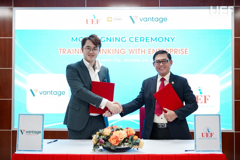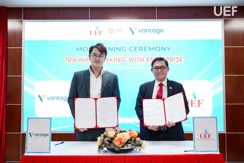 Tiếp tục mở rộng mạng lưới hợp tác toàn cầu, chiều ngày 24/10, UEF đã tổ chức thành công Lễ ký kết MOU cùng Vantage Foundation. Đối tác là tổ chức quốc tế uy tín hoạt động trong lĩnh vực giáo dục và phát triển cộng đồng. Buổi lễ đánh dấu bước tiến mới trong chiến lược kết nối của UEF, hướng đến mục tiêu mang đến cho sinh viên nhiều cơ hội học tập, nghiên cứu và trải nghiệm quốc tế.