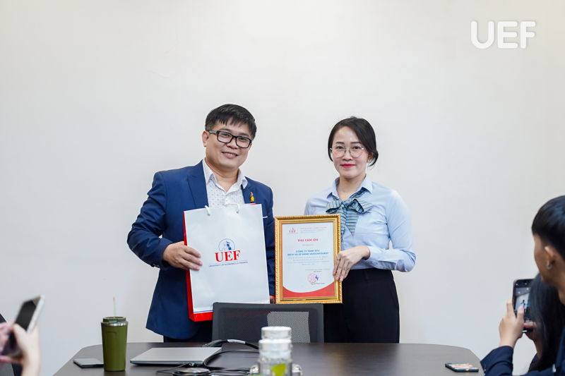 Đại diện Khoa Quản trị du lịch - Khách sạn UEF trao thư cảm ơn cho đơn vị