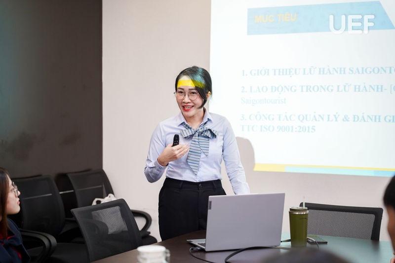 Để hiểu sâu hơn về Lữ hành Saigontourist, bà Đỗ Như Thảo đã có phần chia sẻ chi tiết với các bạn sinh viên đơn vị. Qua đó, sinh viên hiểu rõ hơn về lịch sử hình thành và phát triển, cơ cấu tổ chức nhân sự, các cấp quản lý và vận hành công ty. Ngoài ra, đại diện Lữ hành Saigontourist còn nhắc đến công tác quản lý và đánh giá hệ thống quy trình trong lĩnh vực lữ hành. Đó là những bài học đáng chú ý cho những nhà quản trị du lịch tương lai của UEF.