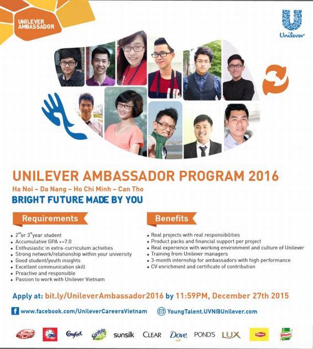 Cách thức ứng tuyển: truy cập http://bit.ly/UnileverAmbassador2016 để nộp CV và đơn ứng tuyển trước 11:59 tối 27/12/2015