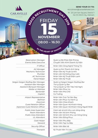 Với mong muốn mở rộng cơ hội việc làm cho các bạn sinh viên, khách sạn Caravelle sẽ tổ chức “Ngày hội việc làm” vào ngày 15/11/2019 từ 8g00 – 16g30 tại Khách sạn Caravelle Saigon.
