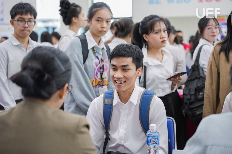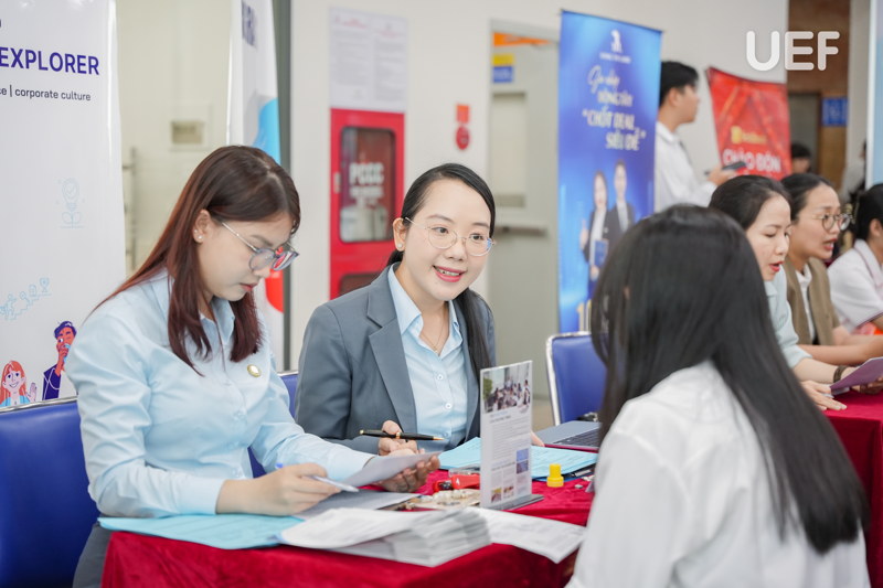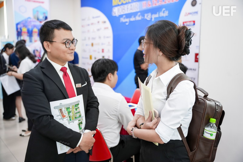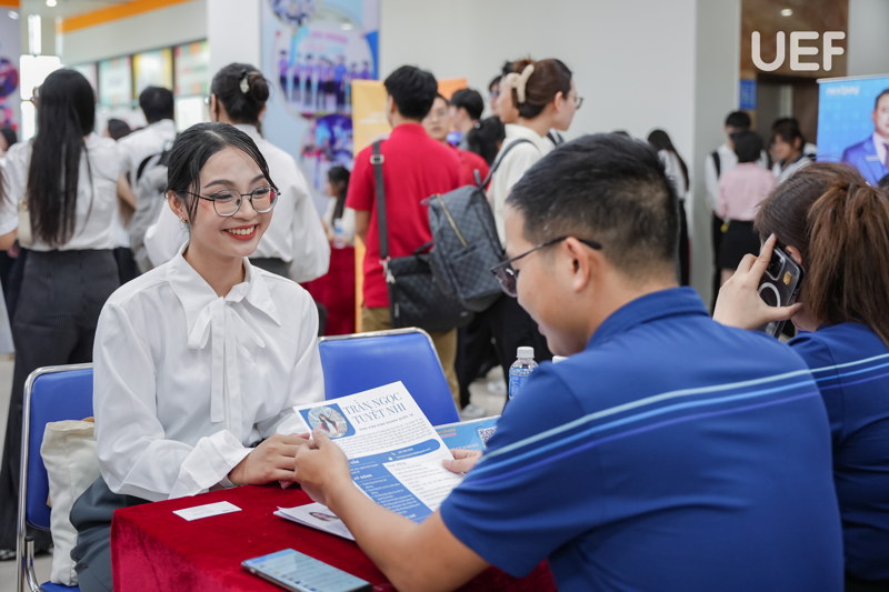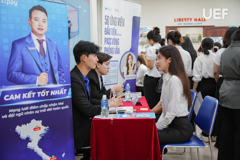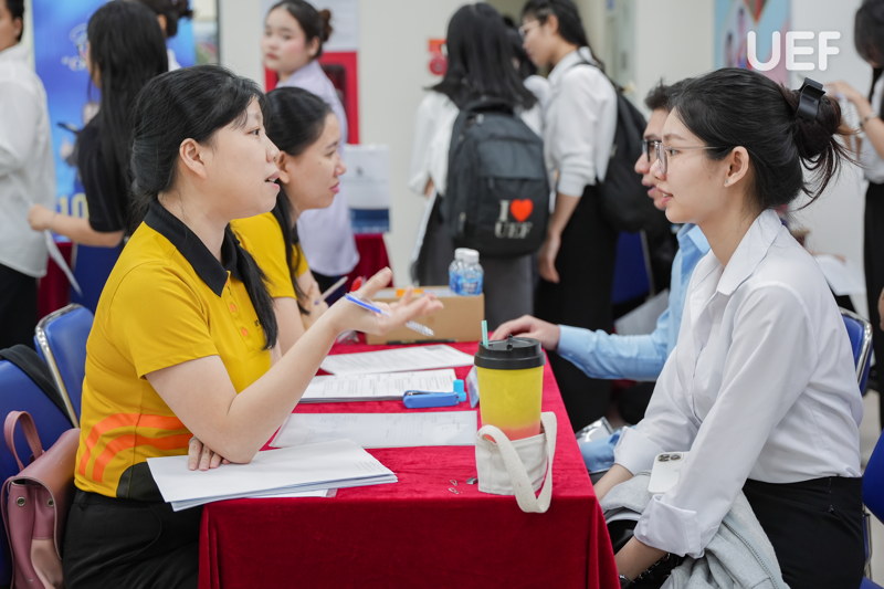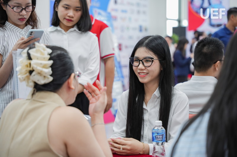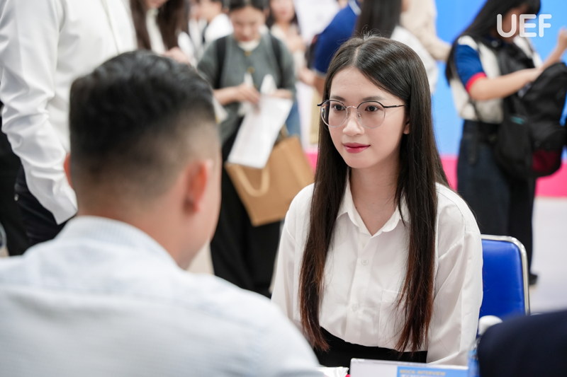 Trong không khí sôi nổi của ngày hội, nhiều sinh viên UEF đã có những trải nghiệm “lần đầu chạm ngõ” đáng nhớ khi trực tiếp bước vào các cuộc phỏng vấn thử với doanh nghiệp. Quá trình này không chỉ giúp các bạn làm quen với quy trình tuyển dụng thực tế từ nộp CV, trả lời câu hỏi đến nhận phản hồi, mà còn là cơ hội nhìn lại chính mình để biết điểm mạnh cần phát huy và những hạn chế cần khắc phục.