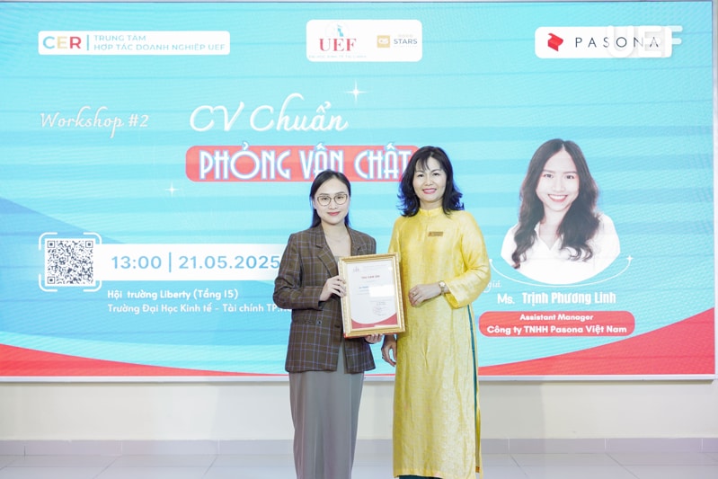 Workshop có sự đồng hành của diễn giả là chị Trịnh Phương Linh - Assistant Manager Công ty TNHH Pasona Việt Nam. Đại diện UEF đến tham dự workshop có ThS. Nguyễn Thị Kim Loan - Phó Giám đốc Trung tâm Hợp tác doanh nghiệp.