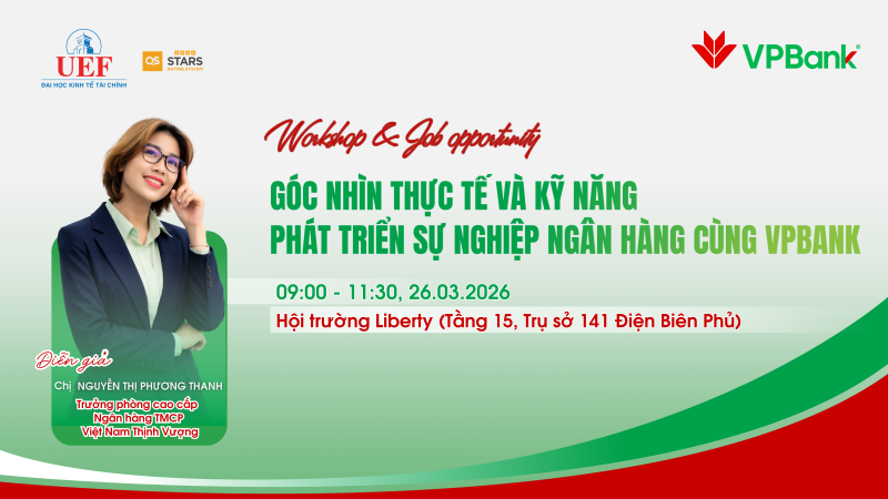 Nhằm mang đến cho sinh viên cơ hội tiếp cận những góc nhìn thực tiễn từ doanh nghiệp, đồng thời định hướng phát triển nghề nghiệp trong lĩnh vực tài chính, Trung tâm Hợp tác Doanh nghiệp UEF phối hợp cùng Ngân hàng TMCP Việt Nam Thịnh Vượng (VPBank) tổ chức workshop “Góc nhìn thực tế và kỹ năng phát triển sự nghiệp ngân hàng cùng VPBank”.