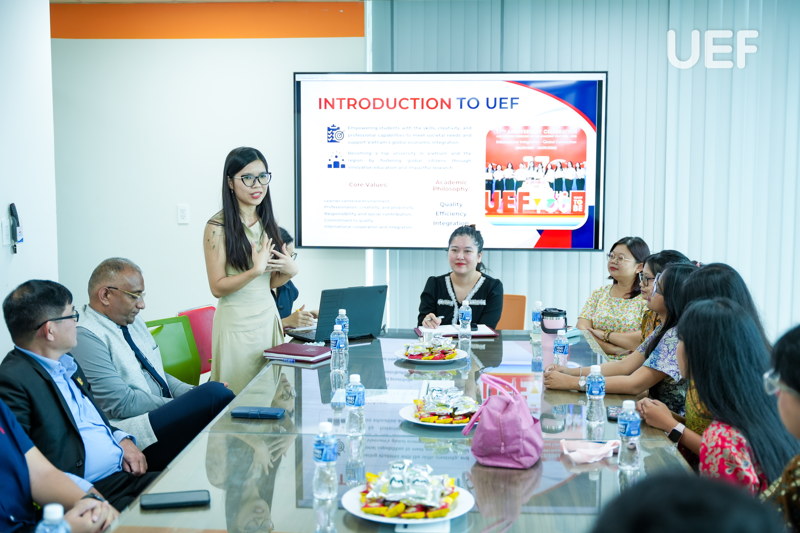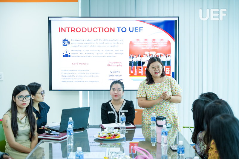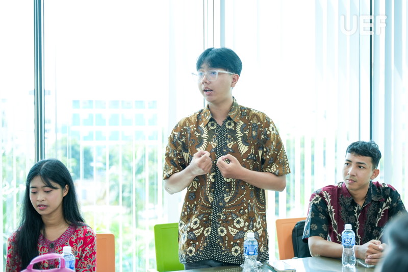 Mở đầu buổi gặp, TS. Nhan Cẩm Trí gửi lời chào mừng nồng nhiệt và giới thiệu tổng quan về UEF, từ môi trường học tập, hoạt động phong trào đến các dịch vụ hỗ trợ sinh viên. Thầy khuyến khích các bạn tích cực tham gia các sinh hoạt của Khoa, Viện để nhanh chóng hoà nhập, mở rộng mối quan hệ học thuật và xã hội trong thời gian ở Việt Nam.