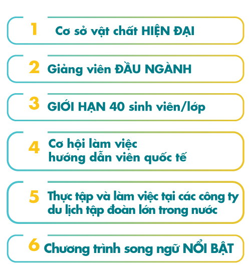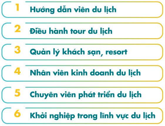 - Sinh viên được cung cấp bài bản những kiến thức và kỹ năng về nghiên cứu và học về địa lý du lịch, văn hóa, tâm lý và tập quán của du khách trong nước và quốc tế, các kỹ năng nghiệp vụ về hướng dẫn du lịch, quản lý và điều hành tour, quản trị sự kiện du lịch,...