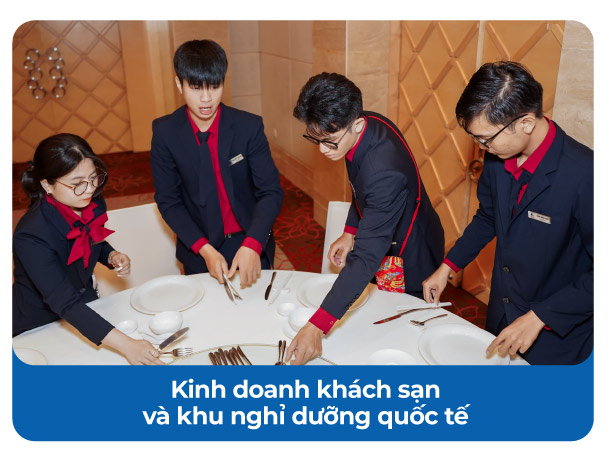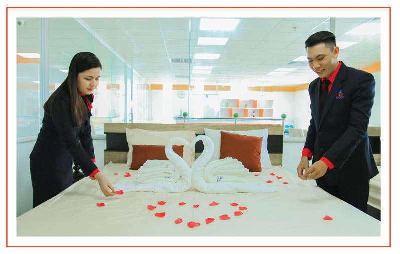 Được thực hành các nghiệp vụ như lễ tân, buồng, bar, ẩm thực,... theo "chuẩn 5 sao" tại hệ thống phòng thực hành và các khách sạn đối tác.