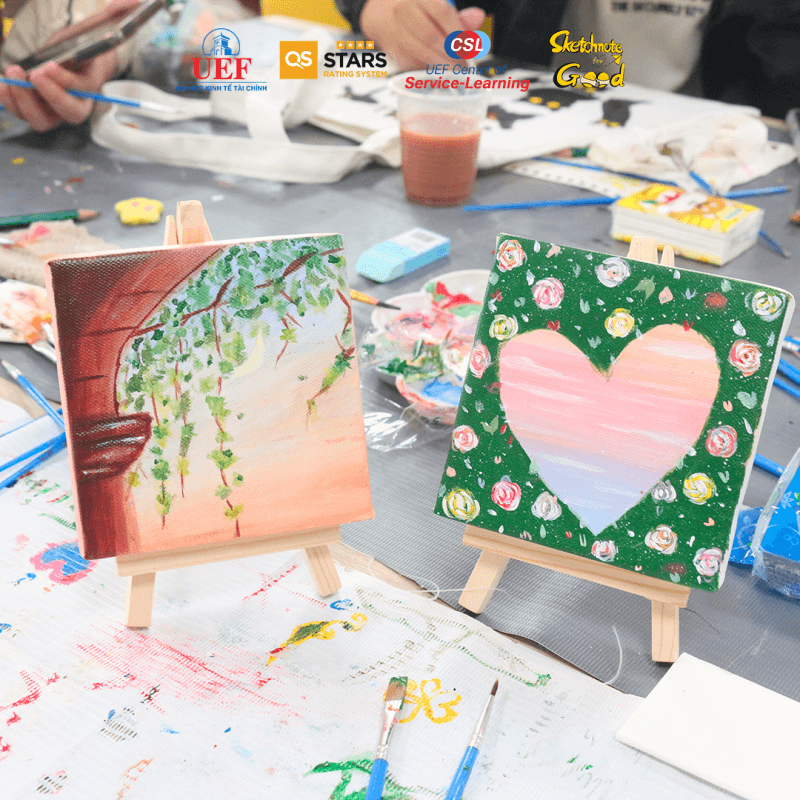 Aiming to raise funds and create a creative space full of positive emotions, a series of workshops with the message "Drawing colors - Touching the hearts" organized by the Sketchnote for Good project of the UEF Service- Learning Center (UEF SLC) ended, and attained new achievements in this 6th operating season. Accordingly, all profits earned at the workshop will contribute to providing learning materials for children at the Niềm Tin Organization, scholarships for children in difficult circumstances in Binh Phuoc, and 10 gifts for poor people in Ba To suburban district, Quang Ngai province.