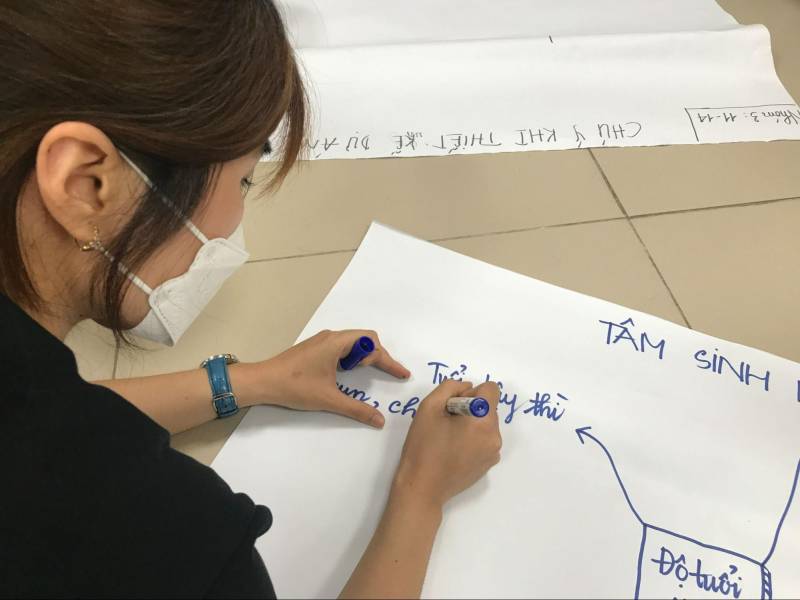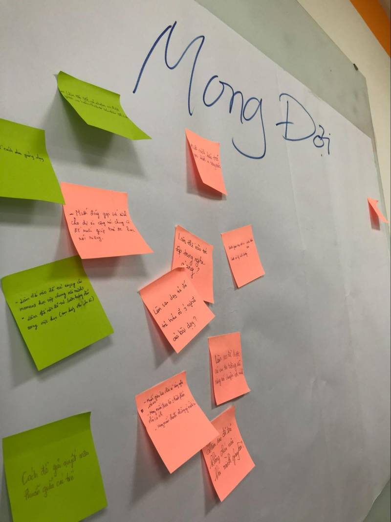 At the beginning of the training session, Ms Phung and the students sat together in a circle, after which each of them would write down their question onto the notes and be given an answer after the session. Everyone then took turns sticking their question on the board, and the ones which have been “untangled” would be removed.