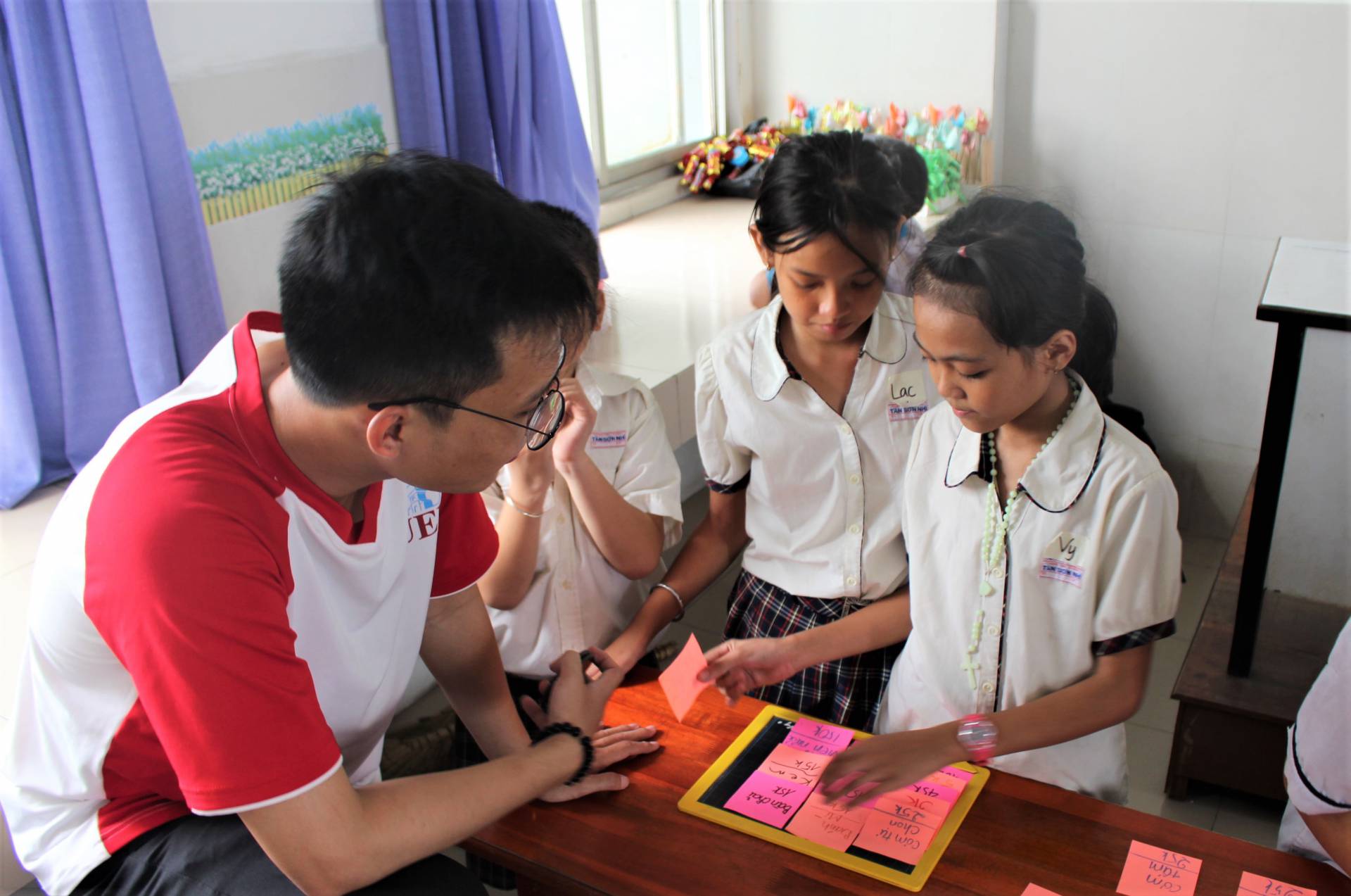 Sinh viên UEF đang giảng bài về kỹ năng chi tiêu cho học sinh Tân Sơn Nhì
