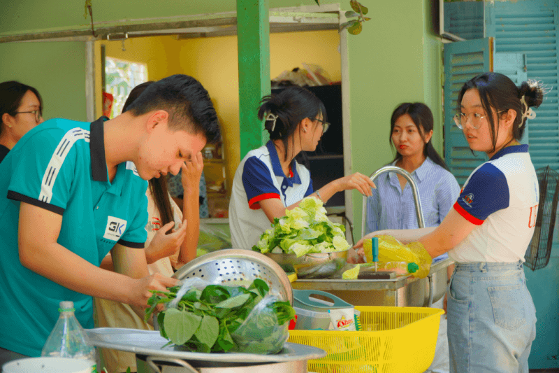 Trong thời gian vui chơi cùng trẻ, chúng mình còn được cùng nhau vào bếp để chuẩn bị những món ăn thật thơm ngon như bánh xèo, cá viên, gỏi bắp bò. Điều khiến bữa ăn trở nên đặc biệt và ý nghĩa đó chính là mẹ Hiền - người chăm lo chính cho các em ở đây, cùng thành viên dự án và các em nhỏ đều xắn tay áo cùng nhau vào bếp.